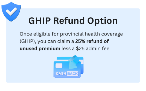 The BestQuote MedEC Visitors policy is the only policy in the world that will provide a partial refund of premium when a policyholder enrolls on provincial GHIP (25% of the remaining premium is refunded once enrolled in provincial GHIP, less a $25 admin fee), which can help lower your IEC insurance costs by several hundred dollars. For example, a person purchasing the MedEC policy with $100,000 coverage and a $0 deductible for 2 years will pay $1,825.00. If the person arrives in Ontario and secures a job that provides them a letter of employment to apply to OHIP (some employers help you to apply) and becomes covered by OHIP benefits after 74 days (for example), they will have $1,640.00 of unused premium remaining on their MedEC policy - so the GHIP refund will provide a premium return of (25% of $1,640.00 = $410.00, less $25.00 for processing =) $385.00.